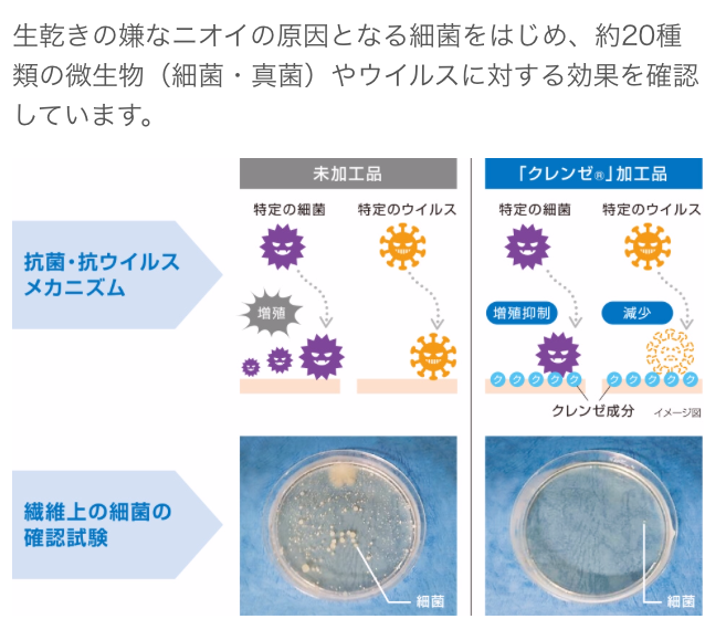 繊維上の特定のウィルスを数多く減少させ特定の細菌の増殖を抑制します。