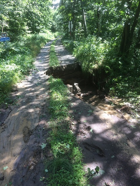 林道も例外ではなく、川の近くにある林道では増水により、道路が削られてしまいました。また、側溝の水もあふれ、道路に土砂が流れ出ている箇所が見られました。