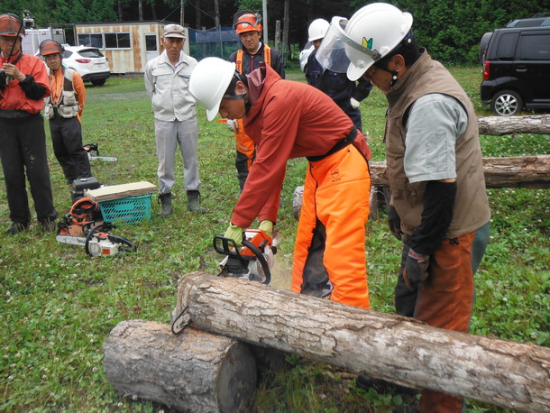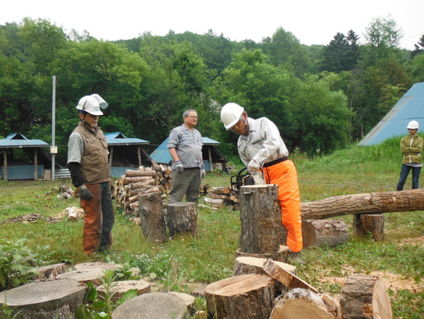午後からは実技研修。チェンソーで丸太を縦から切ったり、横から切ったり。