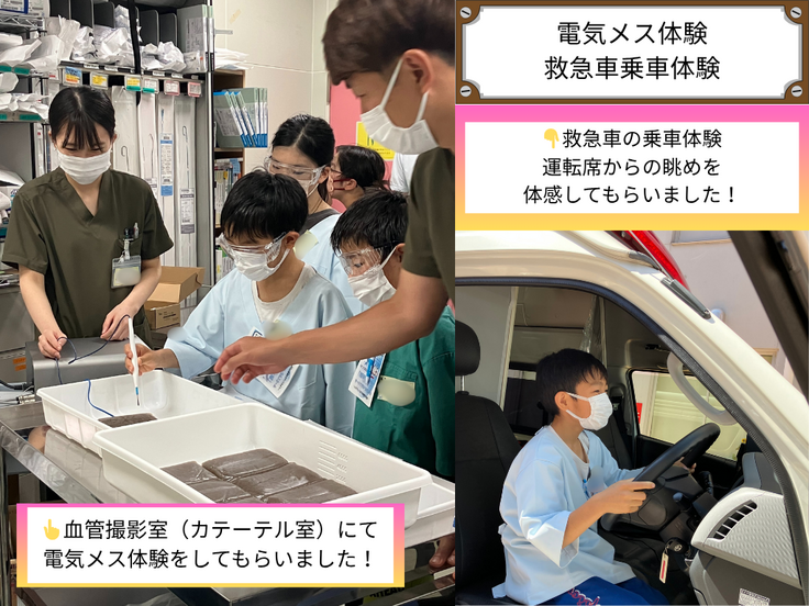 近隣の小中学生(小4~中3) 約30名(抽選倍率約2倍)にご参加いただき、人工血管縫合等の擬似医療処置、血圧測定や車いす介助体験、手術室や救急車の見学を実施し、医療の重要性、病院の役割や医療従事者の仕事への関心と理解を深めていただく初めてのイベントでした。