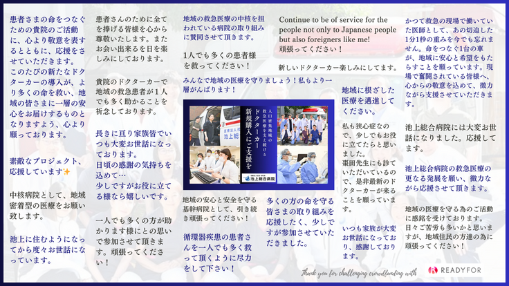 今後は、新たに購入するドクターカーのデザインなど、皆さまのご支援が具体的な形となっていく過程を、この場を通じてご報告してまいります。