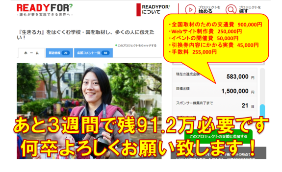 交通費やWebサイト作成費の残りの分は、これからまた、色々な方法で集めていきたいと思っています。