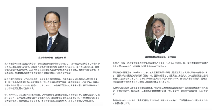 この度、京都府南丹市長 西村 良平様、並びに園部文化観光協会会長 小林 康夫様 のお二方様が、当プロジェクトへ応援メッセージを寄せて下さいました。