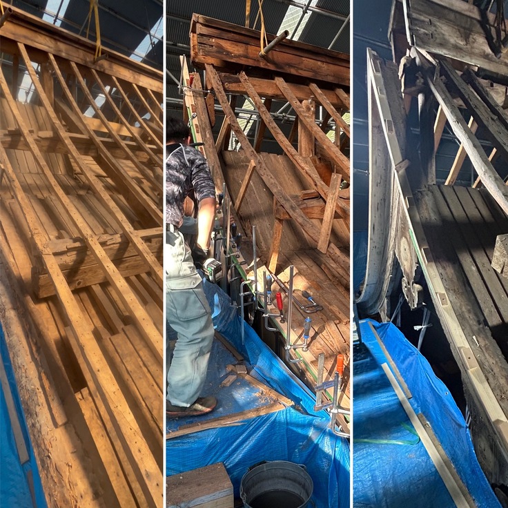 削られた部分をなだらかに整えた後、修復のための新しい木材が取り付けられます。
