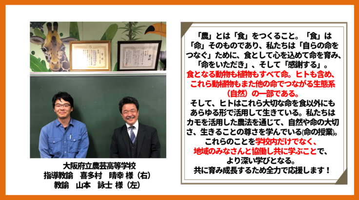 ※大阪府立農芸高等学校の資源動物科/総合環境専攻様からプロジェクトを行うこと、