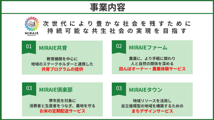 【MIRAIEプロジェクト】の事業内容としては、