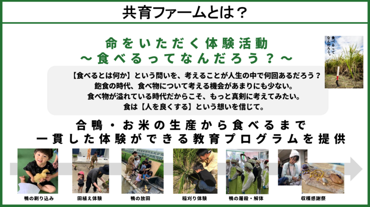 このプロジェクトで高校生が考えたアイディアが、命をいただく体験活動【共育ファーム】であります。