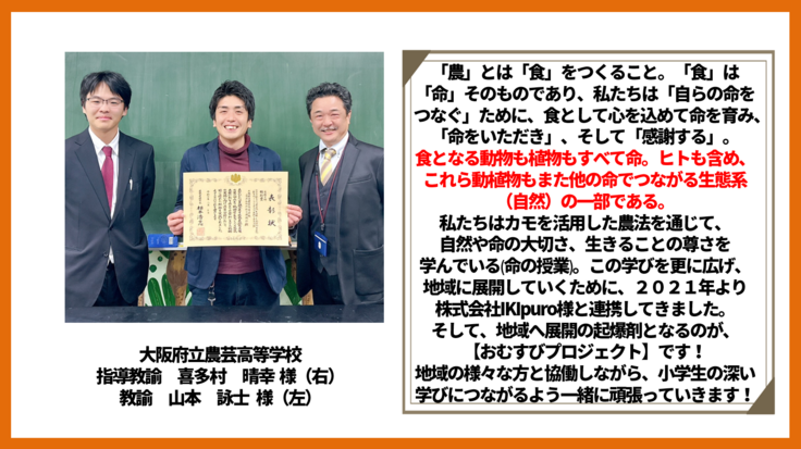 ※大阪府立農芸高等学校の資源動物科/総合環境専攻様からプロジェクトを行うこと、名称掲載を行うことの許諾を取得しております。