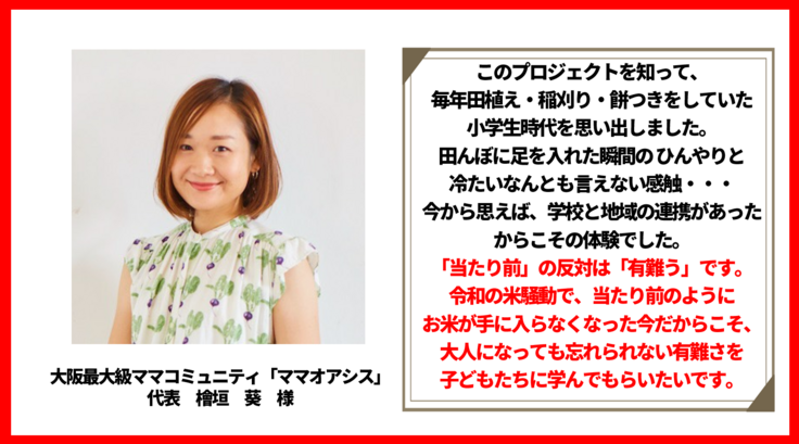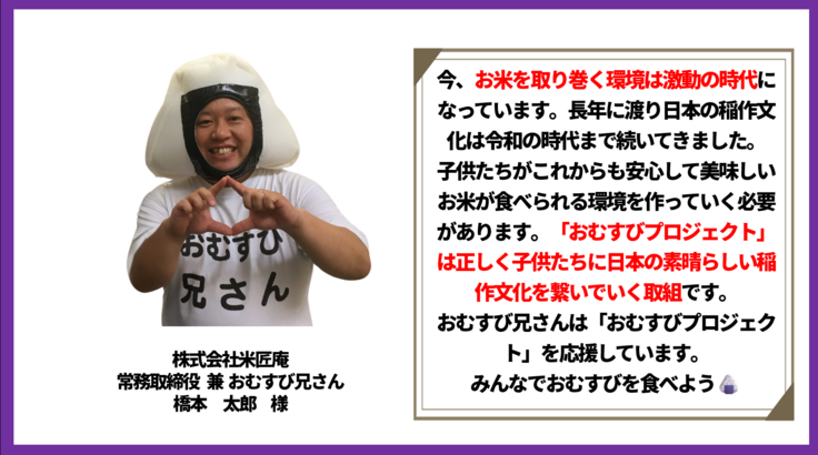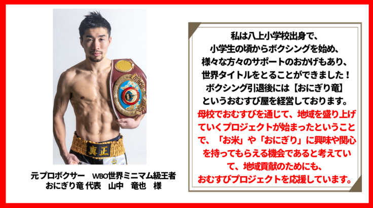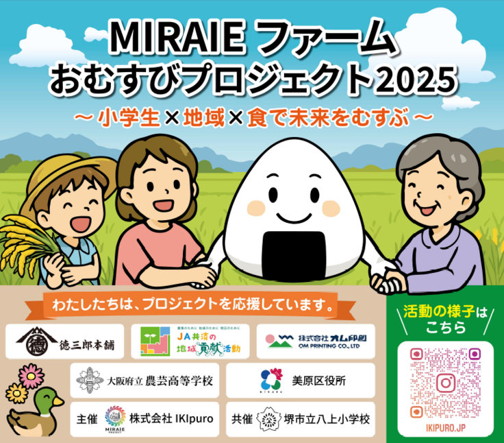 🍙おむすびプロジェクト🍙は、堺市立八上小学校の5年生・6年生が中心になり、【自分達だけの最高のおむすびで美原を盛り上げる】をコンセプトに、地域の農家や企業・住民・行政と協働しながら、合鴨農法によるお米の生産体験・おむすびの商品開発から販売までを実施します。