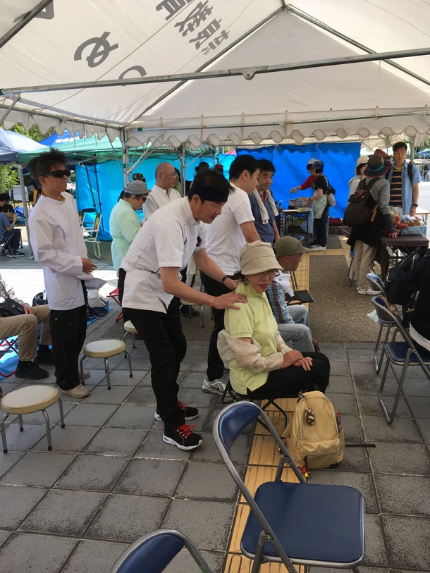私たち視覚障害の会は、「憩い治療院」として、クイックマッサージを行いました。祭りに来られた皆さんの健康チェックと疲労の回復に少しでも役立てばと、みんなでがんばりました。少しずつ憩い治療院の活動の場が広がっています。
