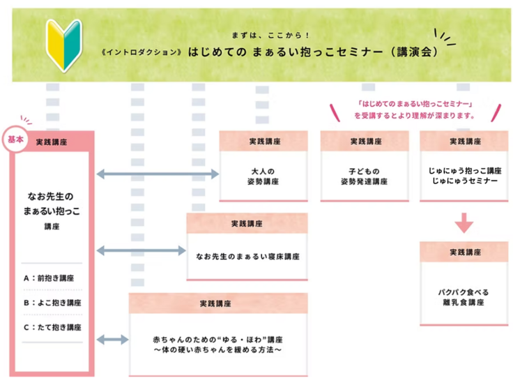 育母塾の講座には、まぁるい抱っこ講座をはじめ、じゅにゅうや離乳食、姿勢発達に関する講座など様々なラインナップがあります。それらの講座を受ける前に、最初に必ず受けて頂くのが「はじめてのまぁるい抱っこセミナー」です。