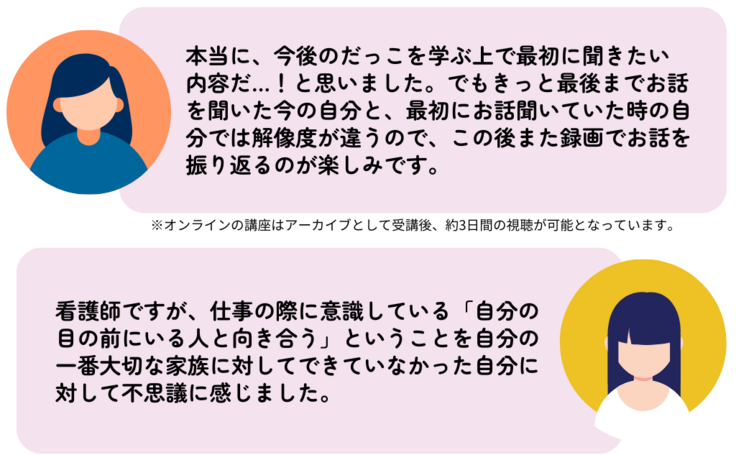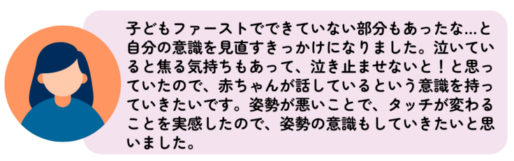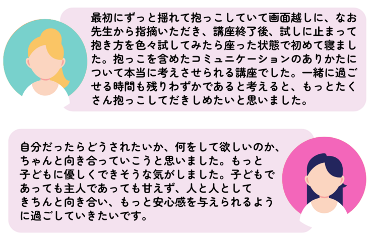 オンラインでも画面越しに一人ひとりと向き合いますので、多くの学びが得られます。そこから見方が変わり、赤ちゃんとの向き合い方が変化すると、赤ちゃんとママ、そしてパパとの関係も変わっていきます。