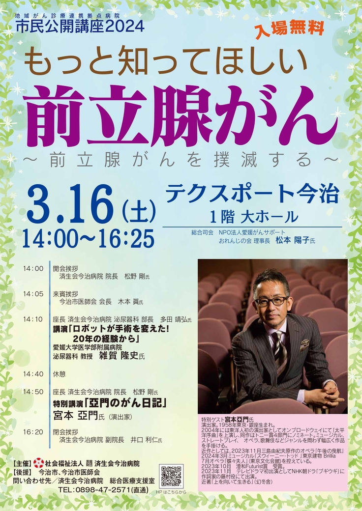 市民の皆さまにも前立腺がんについて、そして前立腺がんのロボット手術について知っていただけるよう、3月16日(土)に市民公開講座を開催することとなりました。