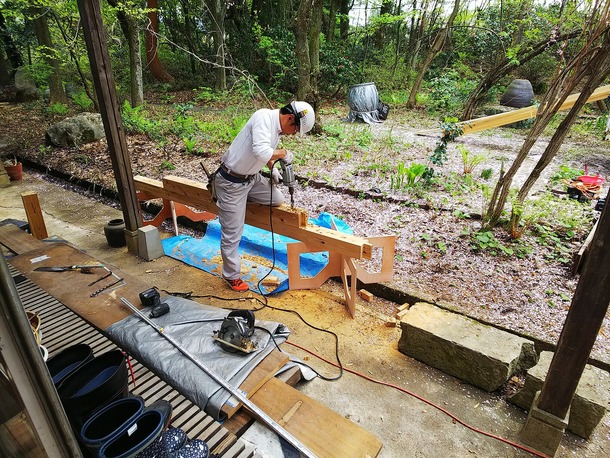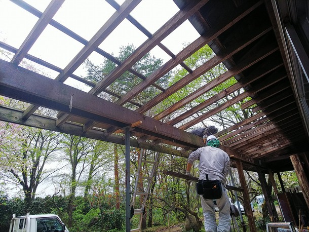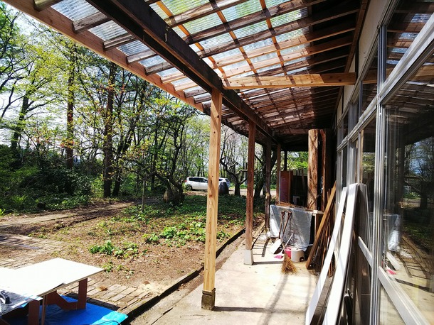 ポリカーボネートの波板に穴が開いていたり、一部地盤が沈下したため梁が折れていたり・・ということで、そこも大工さんに直してもらいました。