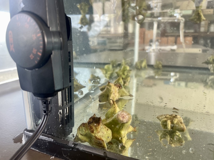 そして、水生植物の成育調査では、菱の種を水槽に入れます。更に水槽ヒーターを導入し、各水槽毎に温度等を変えて、どのように水草が育つのかを調査していきます!