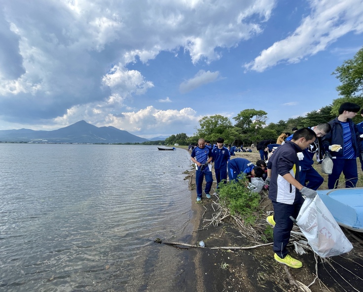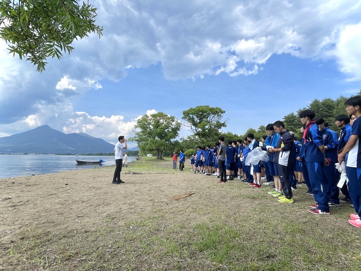 最初は座学で猪苗代湖の水質や、水生植物の利活用について学び、その後は実際に湖に行って環境美化と水質調査のフィールドワークを実施しました。