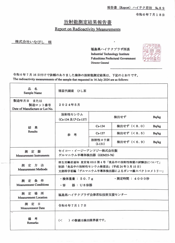 菱の実の栄養素や効能に関するデータは既に多く発表されていますが、さらに安心して健康茶としてお楽しみいただけるよう、毎年検査を実施いたします!
