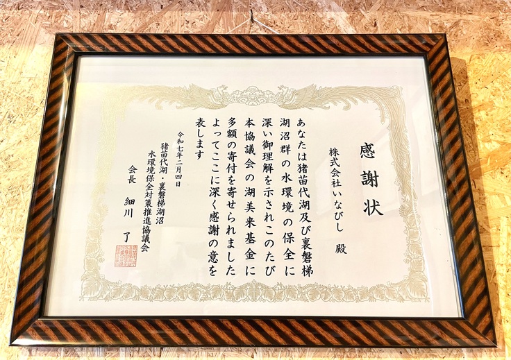 猪苗代湖・裏磐梯湖沼水環境保全対策推進協議会様より、感謝状をいただきました🍵
