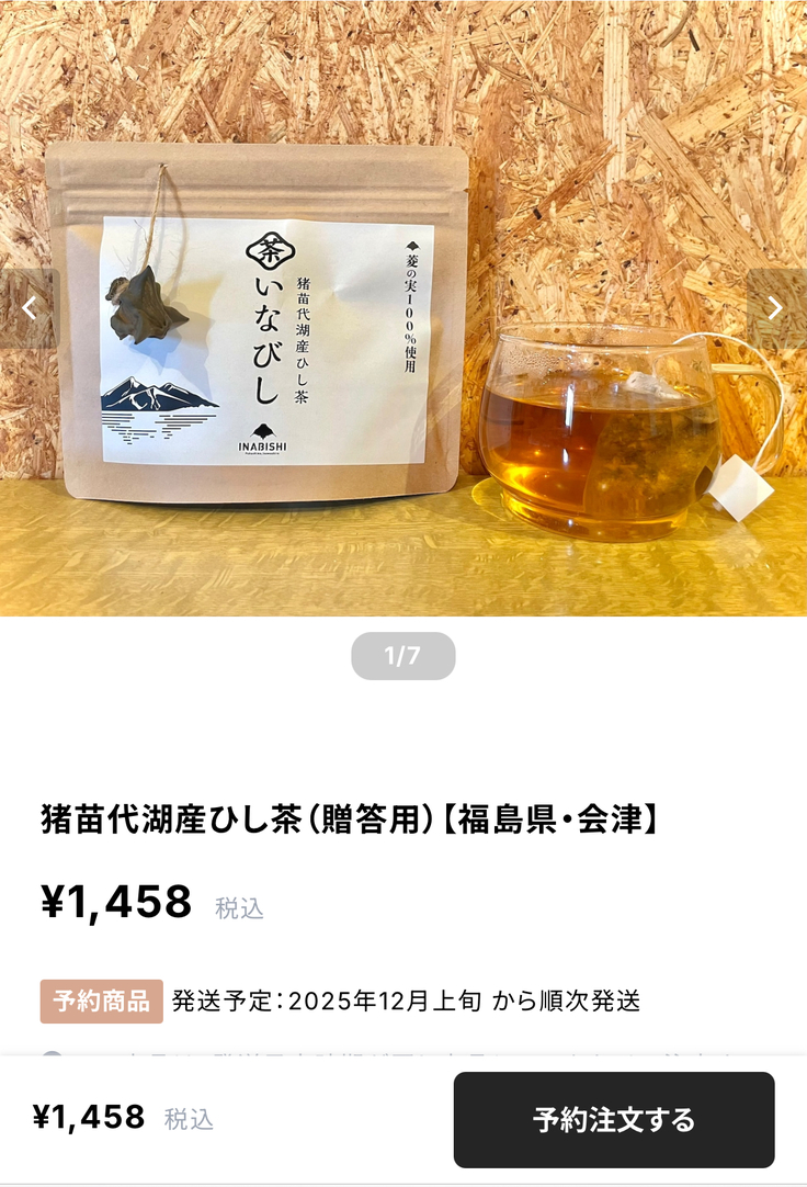 ●ドリンクメニューとして導入した『いなびし茶』または『ひし茶ハイ』を1杯サービス。お越しの際は予めご連絡頂けますと幸いです。