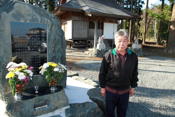 (写真)稲荷神社境内に建てられた震災慰霊碑と地区代表・林さん