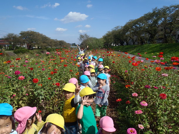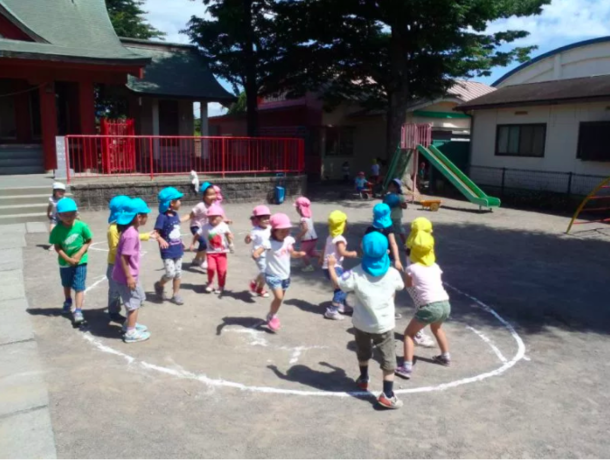 外遊びも年長(青)、年中(黄色)、年少(桃)の帽子がまじって遊んでいます。 鬼ごっこもリレーも年中、年少を仲間に入れるのは当たり前。まるで園全体が一つの家族。そんな生活の中から、見てまねをしたり、教えてもらったり、子どもたちは自然に生活の仕方やルールを覚えていきます。
