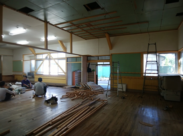 想いでのつまった、古い床材を大切に利用しようという木工作業が