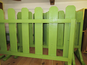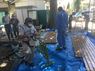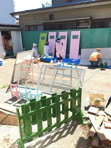 に、園児が使う木の箱や椅子、柵などのペンキ塗りをしました。