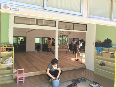 毎週土日の作業日には、暑い中、卒園児のお父さんやお母さん、卒園児など、懐かしい顔が入れ替わり立ちかわり参加してくれました。業者さんにお任せだけでなく、関係者が集まって懐かしい話をしながら、現在や将来の子どもたちに思いをはせ、自分たちの手でいなりもりの園舎に手を加え一緒に作り上げることができました。