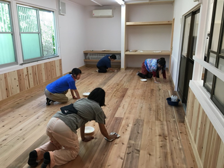 最後の仕上げです。掃除して、新しい床にワックスかけをしています。