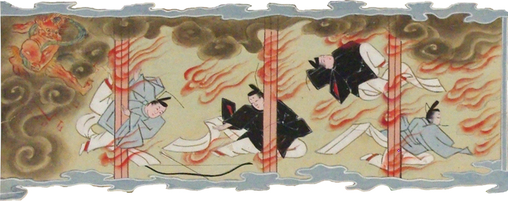 「天満大自在天神」となった道真公が火雷火気毒王を使役し、京都の清涼殿に雷を落としているシーンです。