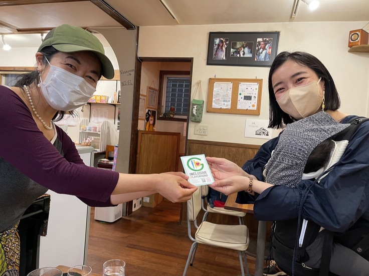 インタビューさせていただいたお店にはインクルーシブ運動場マークのシールをお渡しさせていただきます。街にこのマークが増え、インクルーシブの輪が広がっていくことをイメージしています。