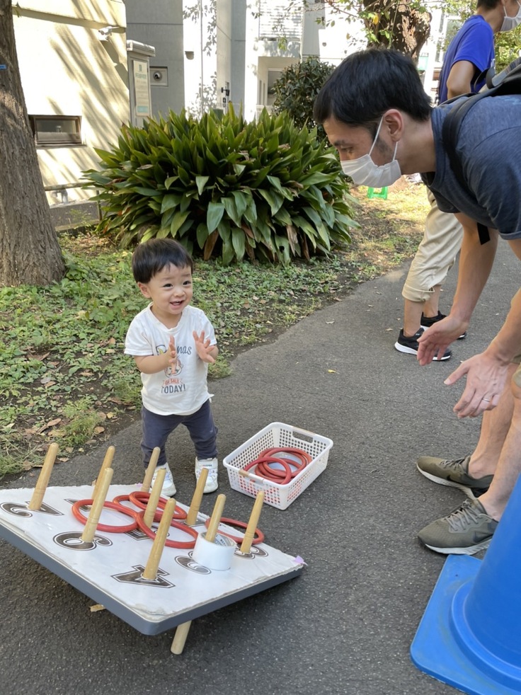 1歳の息子も大興奮でいろいろな遊びに挑戦!運営スタッフさん、通りすがる大人たち、少し年上のお子さん(息子にとってはお兄さんお姉さんたち)とも触れ合い、たくさんの刺激を受けてまた一つ成長したようでした!なんと、こちらでチョーク遊びをした翌日、一度も教えていないのに落ちていた小枝で土にお絵描きができるようになっていました!