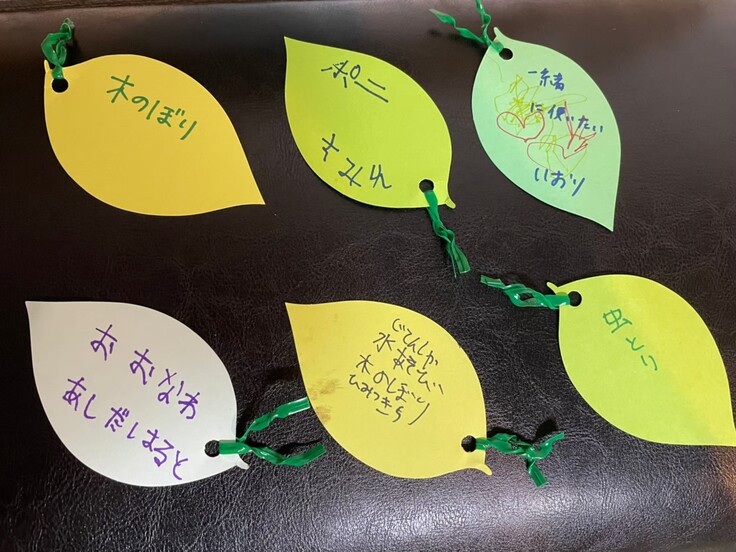 緑道を使う人たち、子どもたちが、緑道を使ってどういうことをしたいのか、を葉っぱのメッセージカードに書いてもらい。そのカードを木に吊り下げて、みんなの想いがつまったWish treeを作りました。