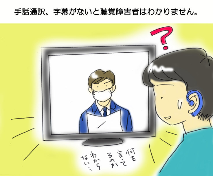 1枚目が何を言ってるのか、わからなくて困っているところ。2枚目は安心して会見を見ているところです。2枚目は手話通訳の手話と口の形、表情が見えるのでわかりやすいです。(手話通訳さんは透明マスクをつけています)