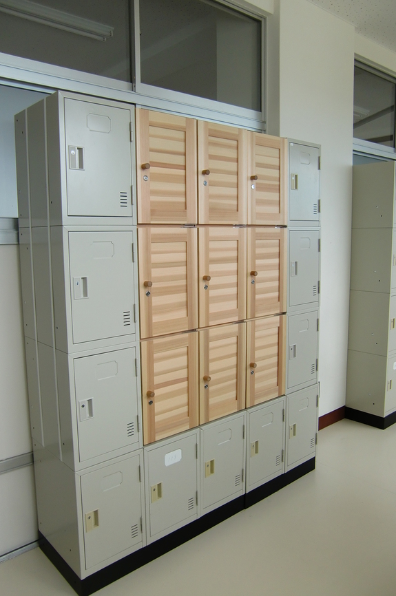 金属製のロッカーと木製のロッカーが混在して学校の廊下に並んでいるのは、少し珍しい光景ではないかと思います。