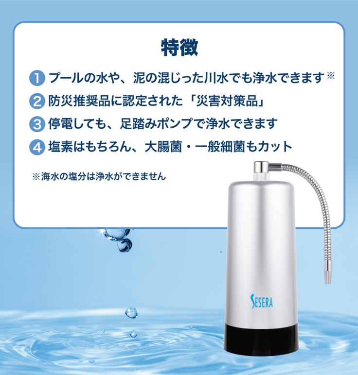 「SESERA」はプール・お風呂の水や雨水を、1台で8000Lまで浄水し、飲み水にすることができます。(詳しくはこちら)。