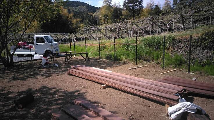 よくあるドッグランのフェンスだと施工が早いのですが、周囲の環境に馴染むよう 木の板を貼る事にしました。