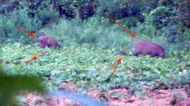 イノシシは、上の写真の通り、夜間活発に行動します。学習能力が高く、安心だとわかると昼間でも平気にあらわれます。