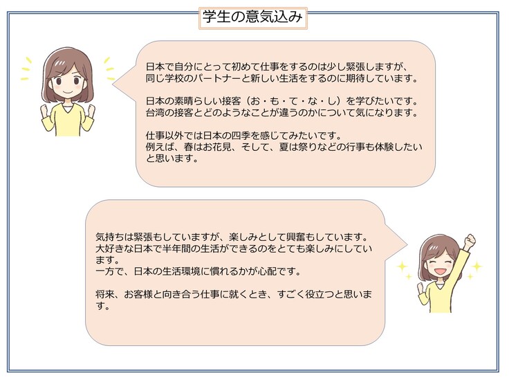 主に、日本語学科を専攻している学生や観光学科を専攻している学生が対象となるため、日本国内でのテーマパークやホテル・旅館にて研修を行うことを予定としております。日本での職場体験は初めての経験となり、日本語学科や観光学科で日本語を学んではいるものの、日本人とはあまり話をする機会もなく、今から緊張をしている学生がほとんどです。