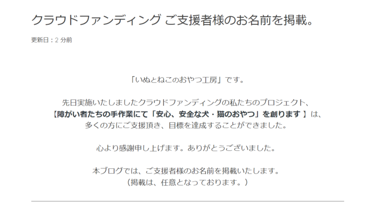 【★応援コース★】にてご支援いただきました支援者様のお名前をブログに掲載させていただきました。(希望制)
