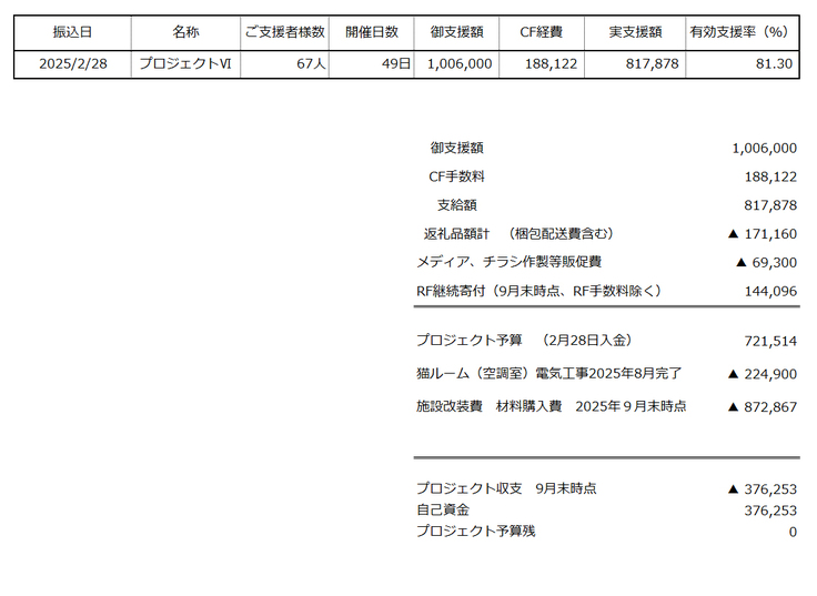 今月、「サービスルーム」が完成いたしました。また、空調完備の猫ルーム(寝室)も8月時点で完成しております。今回のご支援により、電気配線、分電盤、エアコンの設置、換気システムが整い、猫の収容が可能となりました。合わせて、壁面タイプの個別ケージ(個室)の設置、およびサービスルーム(部屋本体)の完成が実現いたしました。皆さまのご支援に、心より感謝申し上げます。以下に、今回の収支についてご参照ください。