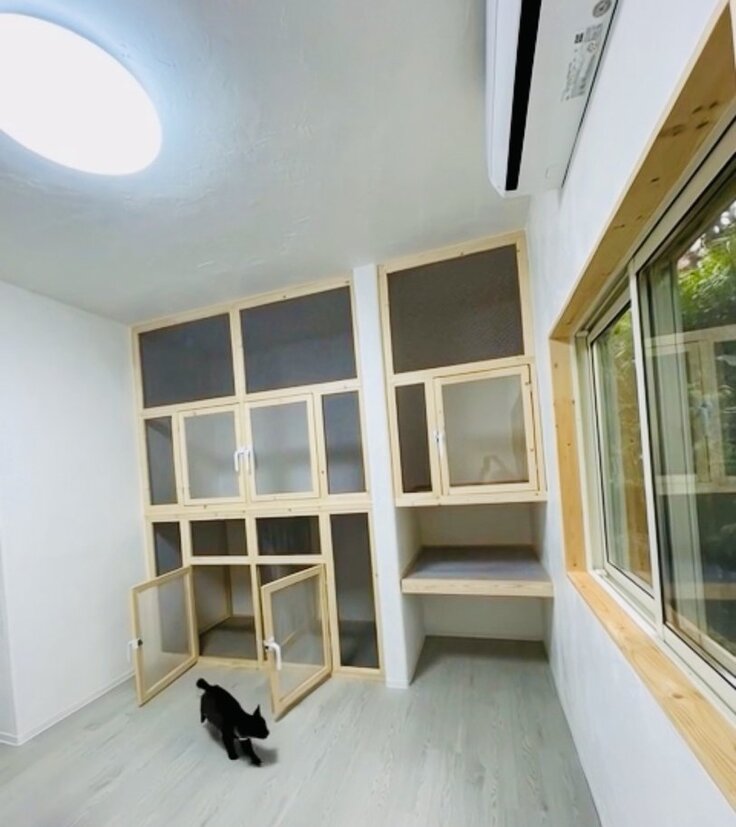 さらに、個別の壁面ケージを5ユニット分設置し、餌や備品の収容スペースを確保。快適性を高めるため、床天井には高性能断熱材、そしてペアガラスの樹脂サッシを、壁天井には漆喰を採用。床は衛生的な抗菌仕様の床材を使用しています。
