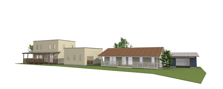 - センターハウス 完成予想図、左側2階建てセンターハウス、1階建て犬舎