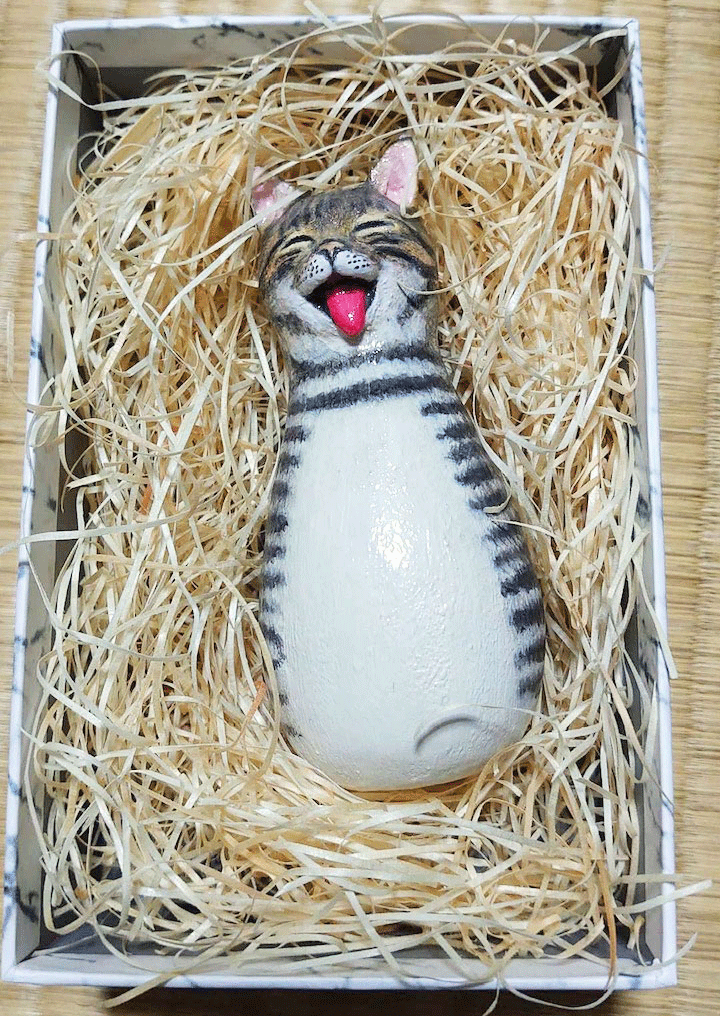開けてみて、模様のグラデーションや耳のピンクっぽい所など、とても忠実に再現していただき感動しております。全身の形、ポーズ、どの角度からみても本人(猫)です。