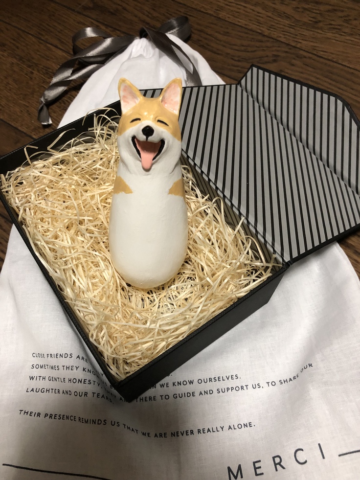 こんにちは。遂にユイちゃんがやってきました😊注文して直ぐにお返事頂き、3日後には発送されました。パッケージも丁寧で、大切にしている事が伝わります!そして、とっても可愛い💕 この笑顔に本当に癒されています。ようこそ我が家へ❣️ 魂が入ってる様で、見守られてます笑 コンパクトでも不思議な重みがあるんですね!ありがとう、これからも保護活動が広がりますように☆E様
