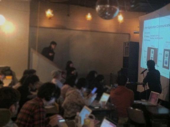 「iOSの教科書」印刷製本プロジェクトにご支援、ご協力をいただき、ありがとうございます。このプロジェクトでは特別レクチャーを行うことになっていますが、一足早く(直接関係ありませんが)2月29日に渋谷のWOMB LOUNGEにてSuperColliderワークショップをしました。SuperColliderは元々Mac用に開発された音響合成プログラミング言語なのですが、私はもちろんiOS用のSuperColliderを取り上げました。このSuperColliderは元祖OOPS(オブジェクト指向プログラミング・システム)であるSmalltalkの影響を受けていて、iOSで使われる、そして「iOSの教科書」で扱っているObjective-Cとも遠い親戚関係にあります。文法は少なからず違いますけど、考え方は似ていますね。