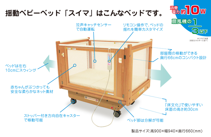 suimaは電動で揺れて赤ちゃんをあやすことができる機能を持ったベビーベッドです。ただ単純に揺れるのではなく、科学的な研究成果をもとに赤ちゃんにとって一番心地よい揺れを再現しています。