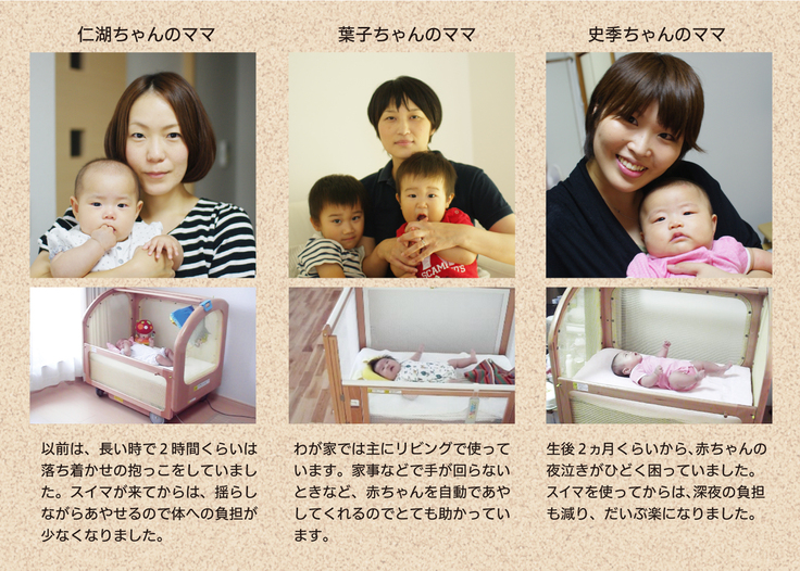あくまでもsuimaは、赤ちゃんが眠いとき(お腹いっぱいでおむつも濡れてないとき)に両親の負担をかけずに寝かせることができるベッドなのです。是非、パパ・ママが抱っこして揺すってあげるという体力面の負担をsuimaで軽減してください。そして、余裕ができた分の愛情を、いっぱい赤ちゃんにそそいであげてください。それが私の願いです。