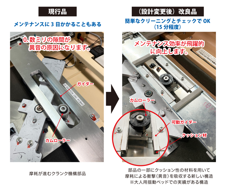メンテナンス調整の作業内容はいくつかありますが、最大の効果を生む策としてクランク機構部の設計変更を考えています。現在の機構は可動カムローラ―がモータ回転によりガイダーを動かす構造になっていますが、カムローラ―とガイダー接触部が長年の使用により隙間ができてしまいました。このため、ベッド揺動の反転時衝撃の増大や異音の発生につながっています。