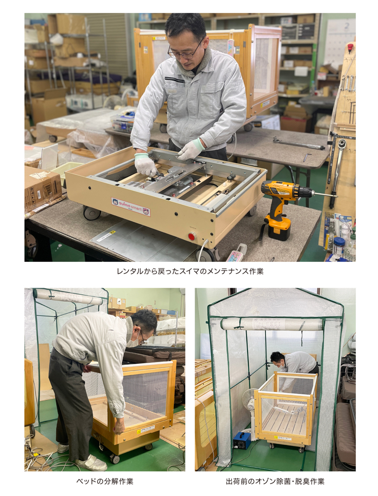 通常、標準的なベビーベッドのレンタルは枠部品をバラした形で発送されることが多いのですが、suimaの場合、駆動部に乗った木製ベッド部が揺れる構造のため、お客様組立の場合、ねじの締め付けが緩かった場合など、異音によるクレームが頻繁に発生していました。